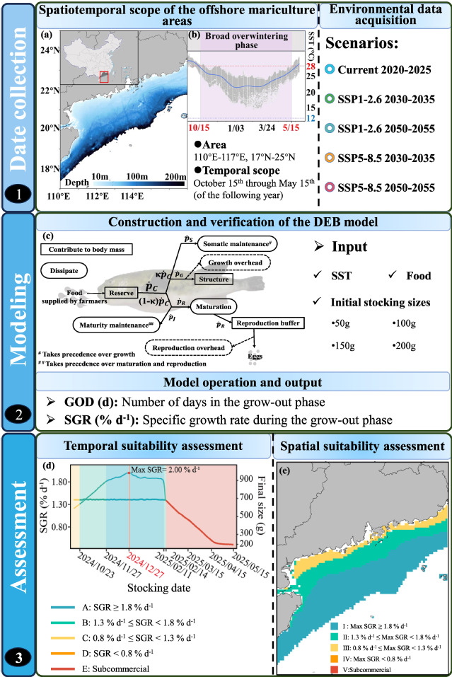 随着近岸渔业资源日益衰退,全球海产品需求持续攀升,深远海养殖已逐步成为保障粮食安全、推动蓝色经济增长的重要战略方向。然而,气候变化带来的不确定性,加之传统静态经验型管理模式存在的局限,正日益威胁深远海养殖的可持续发展。为应对这一挑战,本研究构建了一套基于动态能量收支(DEB)模型、以日为时间尺度的决策框架(图1)。该框架融合时空维度分析,能够同时解决海水养殖中“何时养”和“何地养”两大核心问题,并据此评估红鳍东方鲀(Takifugu rubripes)在中国广东沿海开展越冬养殖的时空适宜性。通过识别当前及未来气候情景下的适宜投放和收获日期及越冬区域,为越冬管理的时空优化提供科学依据。研究结果表明,优化投放日期可缩短养成天数76天,且大规格越冬苗具有更短的养成时间和更宽的适宜养殖窗口。未来气候情景模拟进一步揭示,低排放情景(SSP1-2.6)与高排放情景(SSP5-8.5)下的适宜性格局存在显著差异,气候变暖将导致适宜养殖窗口呈收缩趋势。