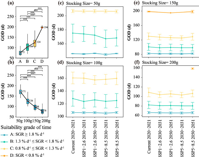 不同时间适宜性等级间GOD差异极显著(p < 0.001),时间适宜性等级越高,GOD越小且越稳定,等级越低,则GOD越大且波动大;GOD在不同放苗规格间同样差异极显著(p < 0.001),苗种规格增大可显著缩短GOD;从当下到未来,同一投放规格下,A等级的GOD均值在保持相对稳定;而B、C等级GOD均值总体呈先缩短后增加的趋势(图3)。