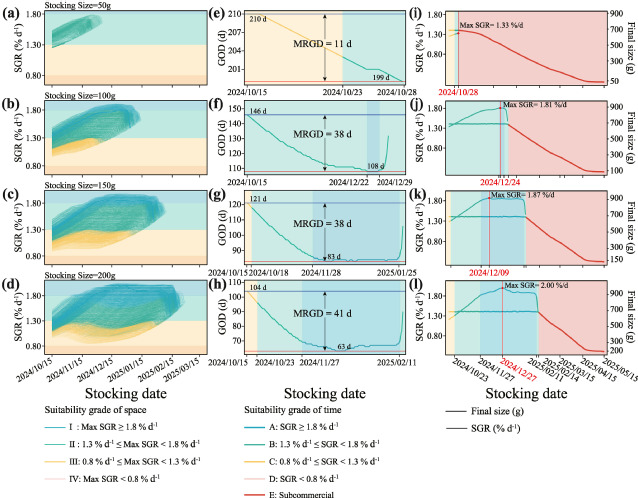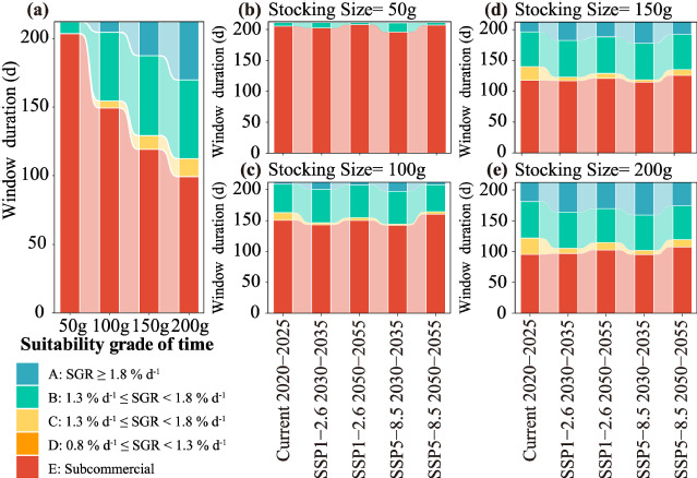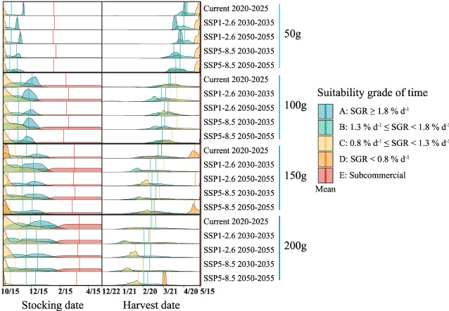 养成天数(GOD)随投放日期呈现出不同变化趋势,且该趋势因投放规格而异:50 g规格苗种的GOD随投放日期的推迟呈下降趋势,而100、150 和200 g规格则表现为先降后升的凹形曲线;养成阶段的特定生长率(SGR)变化趋势与GOD相反;适宜性最低等级E的窗口期随苗种规格增大而缩短,而最高适宜性等级A的窗口期则相应扩大(图2)。