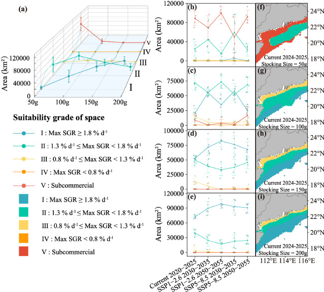 随投放规格增大,各空间适宜性等级面积呈现如下规律:最高适宜性等级(Ⅰ等级)面积持续增加,最低适宜性等级(Ⅴ等级)面积持续减少;中等适宜性等级(Ⅱ等级与Ⅲ等级)则均呈先增后减的单峰型变化(图 6a)。50 g与100 g投放规格下,Ⅴ等级面积从当下到未来先减小后增大(图 6b、c)。150 g与200 g投放规格下,Ⅰ等级面积在 SSP1‑2.6 情景下持续增加,而在 SSP5‑8.5 情景下先增后减小(图 6d、e),表明无减缓措施的气候变暖(SSP5‑8.5)将导致适宜养殖面积缩减。对于150、200 g大规格苗种,大部分海域适宜养殖,不同适宜性等级呈带状分布,离岸及深远海海域养殖适宜性更高,而小规格苗种空间适宜性分布的年际波动显著大于大规格苗种的。综上所述,增大放苗规格可提升适宜养殖空间分布稳定性,而气候变暖将对海水养殖适宜性形成持续约束。